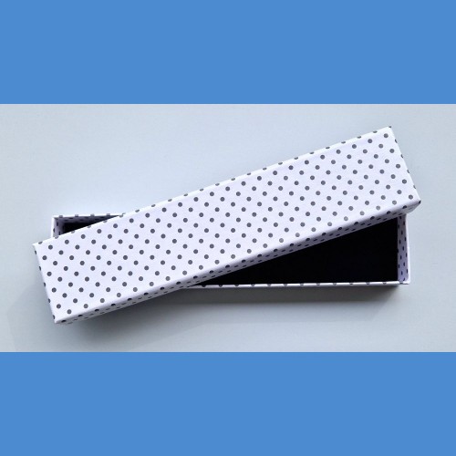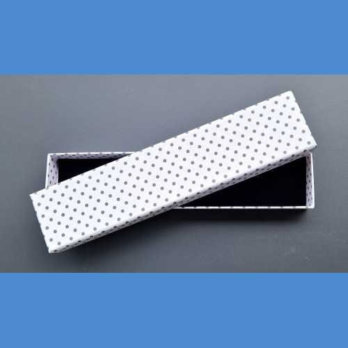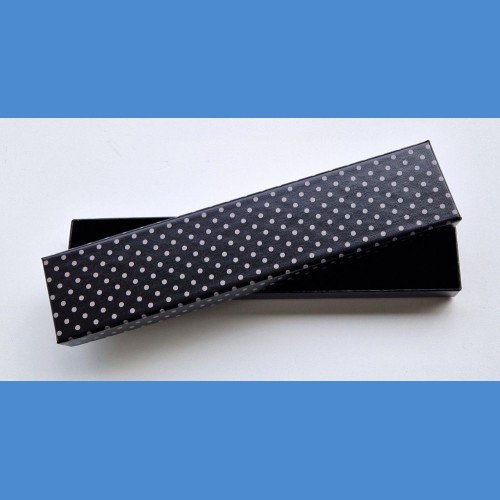 Standartní papírová krabička s puntíky. Vnitřní flokáž v barvě černé.